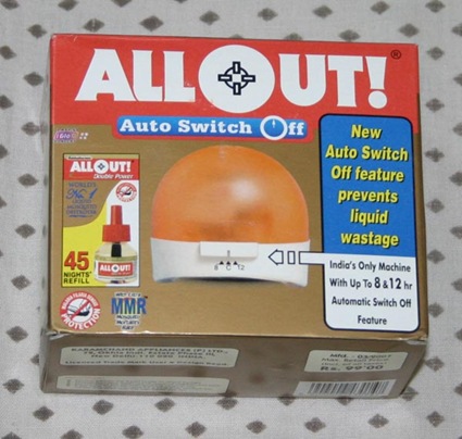 This morning, we went to Big Bazaar for routine shopping and I found a mosquito repellant device with auto switch-off! Wow! I feel it was just made for me!!!